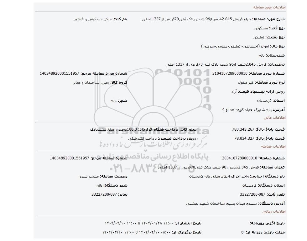 | شرح مورد معامله: حراج فروش 2.045شعیر از96 شعیر پلاک ثبتی70فرعی از 1337 اصلی | نام کالا: اماکن مسکونی و اقامتی | |