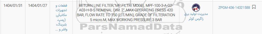 | ZPGM-436-14321588 | مدیریت تولید برق زاگرس کوثر | RETURN LINE FILTER,"MP FILTRI MODEL MPF-100-3-A-G2-A03-H-B-S NOMINAL DIM. 2", MAX OPERATING PRESS 420 BAR, FLOW RATE TO 750 (LIT/MIN), GRADE OF FILTERATION 5. micro.M, MAX WORKING PRESSURE 3 BAR | قطعات و تجهیزات مکانیکی (پمپ، بلبرینگ واشر و .....) | 1404.01.27 | 1404.01.31 |
