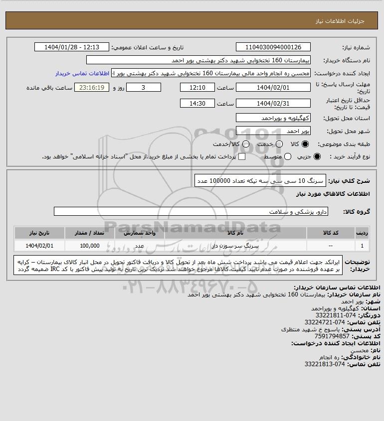 شرح کلی نیاز: سرنگ 10 سی سی سه تیکه تعداد 100000 عدد