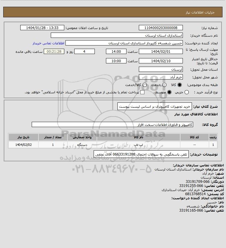 شرح کلی نیاز: خرید تجهیزات کامپیوتری بر اساس لیست پیوست