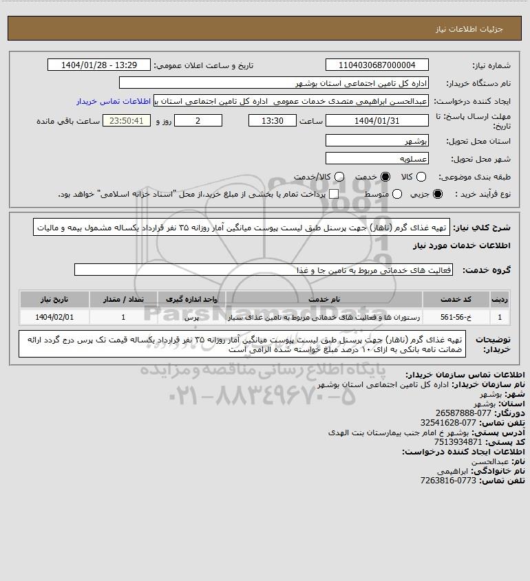 شرح کلی نیاز: تهیه غذای گرم (ناهار) جهت پرسنل طبق لیست پیوست میانگین آمار روزانه ۳۵ نفر قرارداد یکساله مشمول بیمه و مالیات