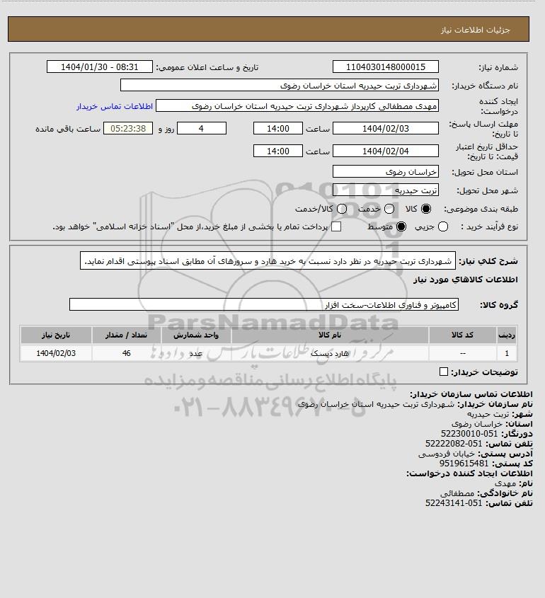 شرح کلی نیاز: شهرداری تربت حیدریه در نظر دارد نسبت به خرید هارد و سرورهای آن مطابق اسناد پیوستی اقدام نماید.