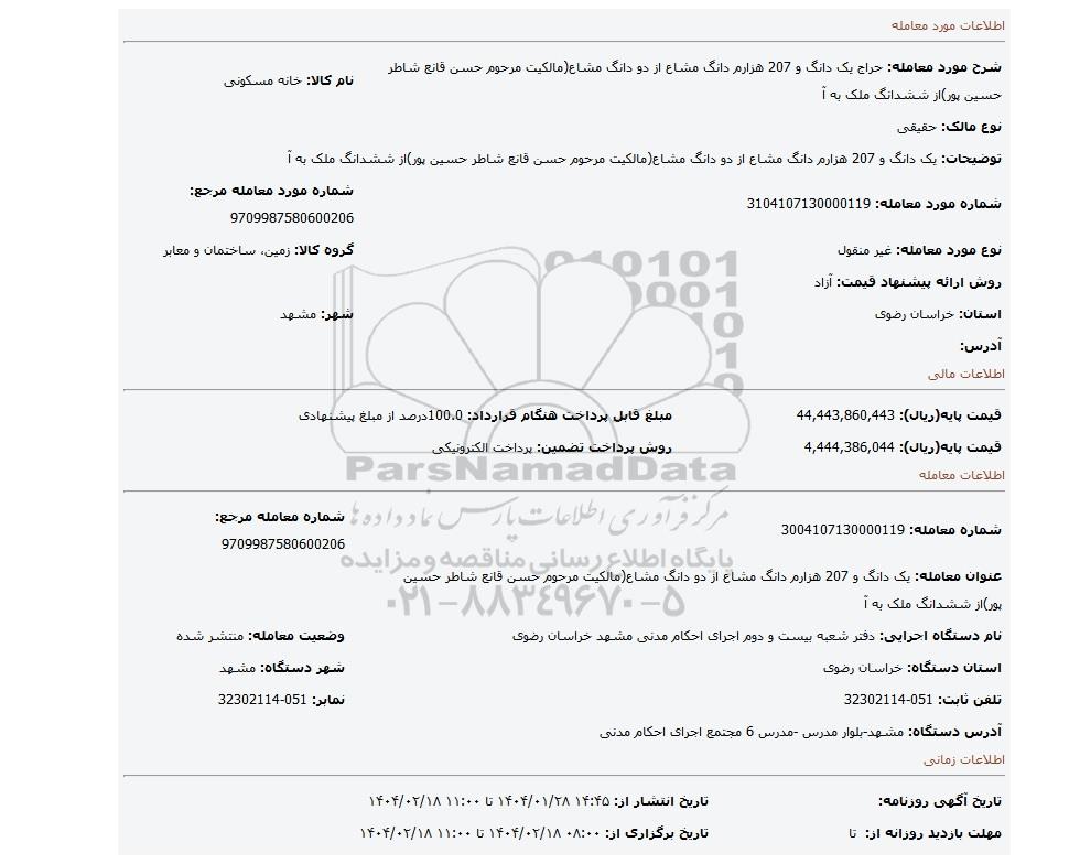 | عنوان معامله: یک دانگ و 207 هزارم دانگ مشاع از دو دانگ مشاع(مالکیت مرحوم حسن قانع شاطر حسین پور)از ششدانگ ملک به آ | ||