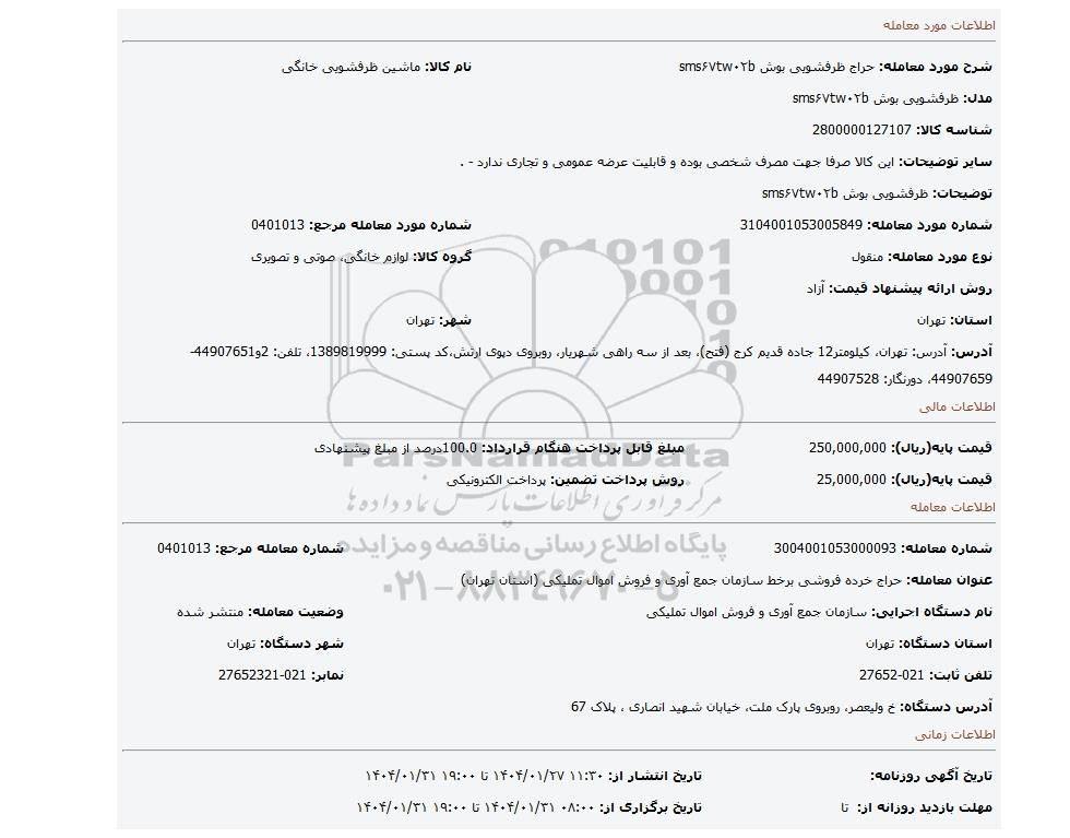 عنوان معامله: حراج خرده فروشی برخط سازمان جمع آوری و فروش اموال تملیکی (استان تهران)