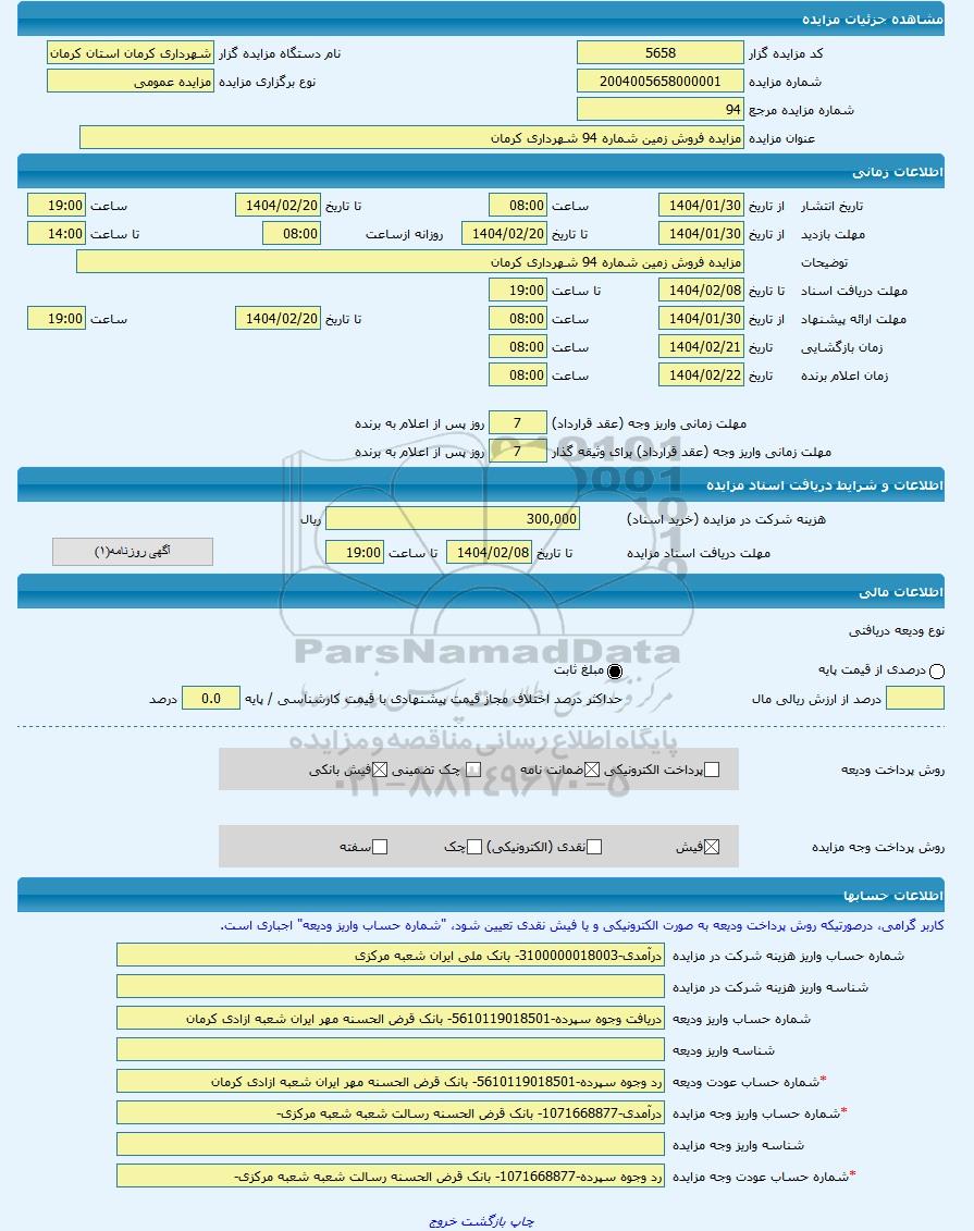 | توضیحات | مزایده فروش زمین شماره 94 شهرداری کرمان | ||||||
