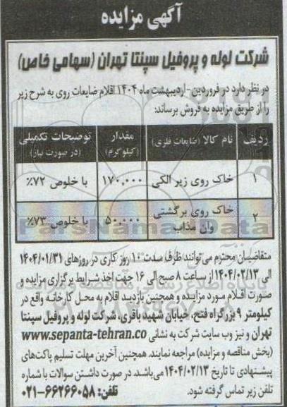 متقاضیان محترم میتوانند ظرف مدت 10 روز کاری در روزهای 1404.01.31 الى 1404.02.13 از ساعت 8 صبح الی 16 جهت اخذ شرایط برگزاری مزایده و صورت اقلام مورد مزایده و همچنین بازدید اقلام به محل کارخانه واقع در کیلومتر 9 بزرگراه فتح خیابان شهید باقری شرکت لوله و پروفیل سپنتا www.sepanta-tehran.co تهران و نیز وب سایت شرکت به نشانی بخش مناقصه و مزایده مراجعه نمایند. همچنین آخرین مهلت تسلیم پاکتهای پیشنهادی تا تاریخ 1404.02.13 میباشد. در صورت داشتن سوالات با شماره تلفن زیر تماس گرفته شود.