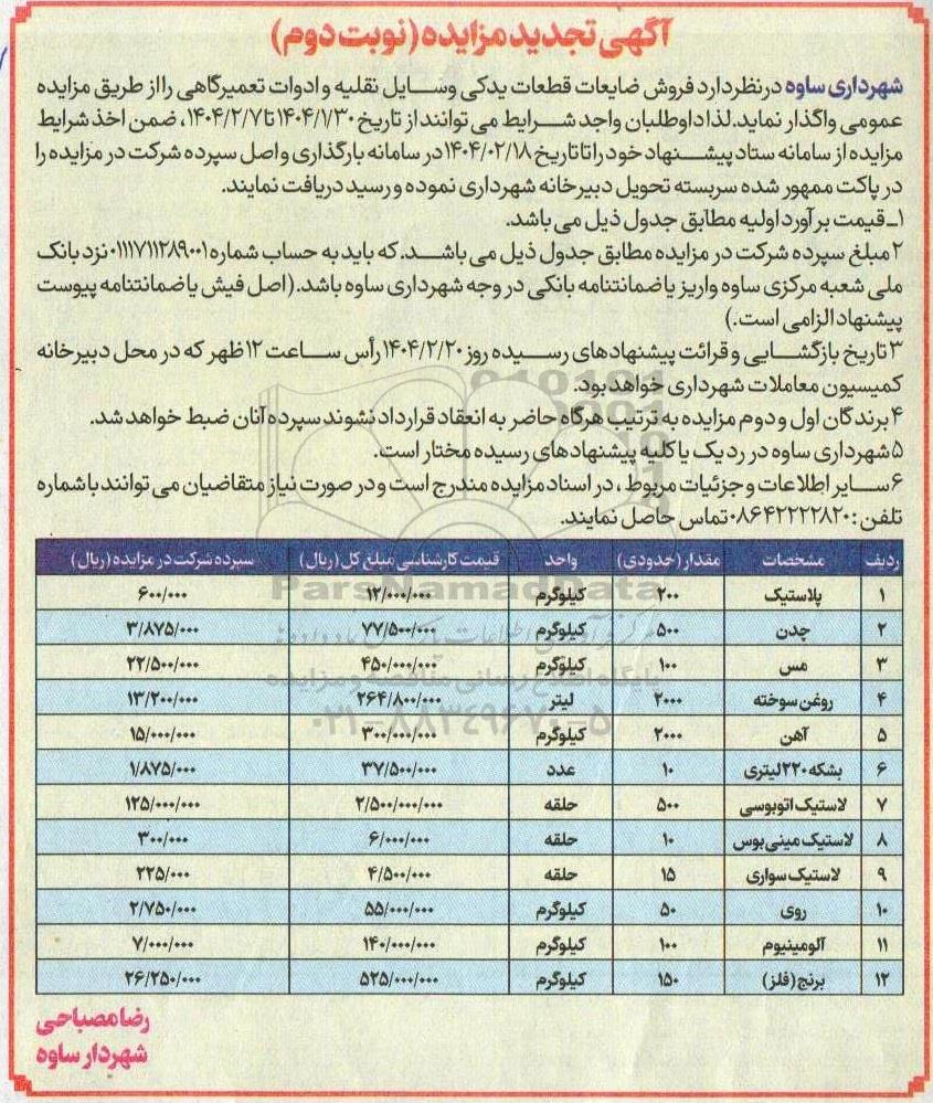 شهرداری ساوه در نظر دارد فروش ضایعات قطعات یدکی وسایل نقلیه و ادوات تعمیرگاهی را از طریق مزایده عمومی واگذار نماید. لذا داوطلبان واجد شرایط میتوانند از تاریخ 1404.1.30 تا 1404.2.7، ضمن اخذ شرایط مزایده از سامانه ستاد پیشنهاد خود را تا تاریخ 1404.2.18 در سامانه بارگذاری و اصل سپرده شرکت در مزایده را در پاکت ممهور شده سربسته تحویل دبیرخانه شهرداری نموده و رسید دریافت نمایند.