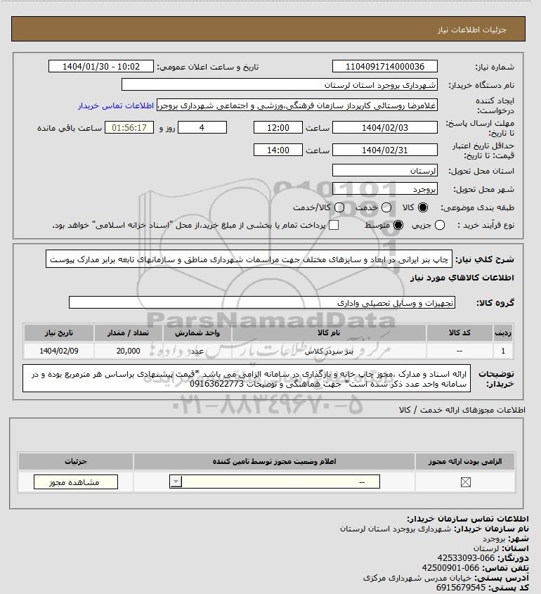 شرح کلی نیاز: چاپ بنر ایرانی در ابعاد و سایزهای مختلف جهت مراسمات شهرداری مناطق و سازمانهای تابعه برابر مدارک پیوست