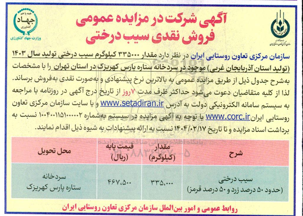 سازمان مرکزی تعاون روستایی ایران در نظر دارد مقدار 335000 کیلوگرم سیب درختی تولید سال 1403 تولید استان آذربایجان غربی موجود در سردخانه ستاره پارس کهریزک در استان تهران را با مشخصات به شرح جدول ذیل از طریق مزایده عمومی به بالاترین نرخ پیشنهادی و به صورت نقدی به فروش برساند. لذا از کلیه متقاضیان دعوت میشود حداکثر ظرف مدت 7 روز از تاریخ درج آگهی در روزنامه با مراجعه به سیستم سامانه الکترونیکی دولت به آدرس ستاد ایران  و یا سایت سازمان مرکزی تعاون روستایی ایران www.corc.ir با توجه به آگهی مزایده در سیستم به شماره 1004001151000002 نسبت به برداشت اسناد مزایده و تا تاریخ 1404.02.17 نسبت به ارائه پیشنهادات به شیوه ذیل اقدام نمایند.