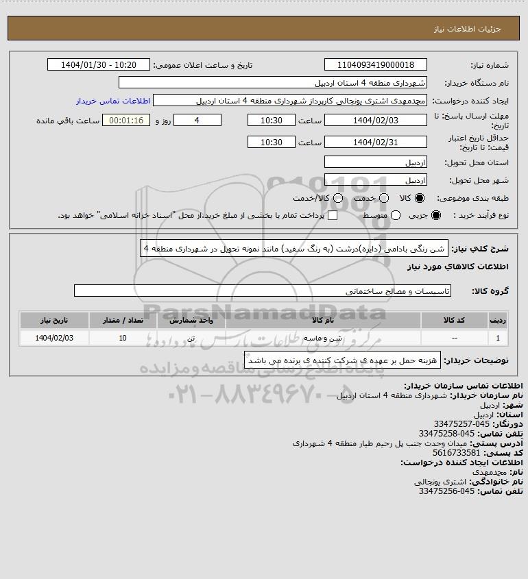 استعلام شن رنگی بادامی (دایره)درشت (به رنگ سفید) مانند نمونه تحویل در شهرداری منطقه 4, استعلام شن رنگی بادامی (دایره)درشت (به رنگ سفید) مانند نمونه تحویل در شهرداری منطقه 4