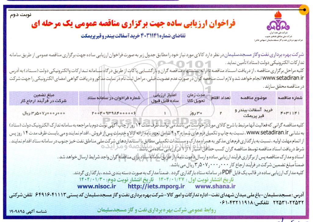 | 4031141 | خرید آسفالت بیندر و قیر پریمکت | 2 | 30 روز | 2004093984000006 | 3.507.000.000 ریال |