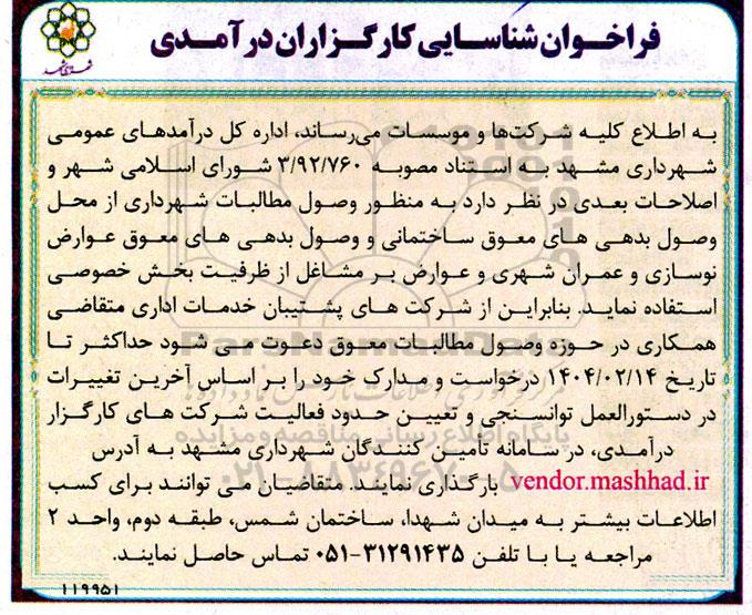 به اطلاع کلیه شرکتها و موسسات میرساند اداره کل درآمدهای عمومی شهرداری مشهد به استناد مصوبه 3/92/760 شورای اسلامی شهر و اصلاحات بعدی در نظر دارد به منظور وصول مطالبات شهرداری از محل وصول بدهی های معوق ساختمانی و وصول بدهیهای معوق عوارض نوسازی و عمران شهری و عوارض بر مشاغل از ظرفیت بخش خصوصی استفاده نماید. بنابراین از شرکتهای پشتیبان خدمات اداری متقاضی همکاری در حوزه وصول مطالبات معوق دعوت می شود حداکثر تا ه تاریخ 1404.02.14 درخواست و مدارک خود را بر اساس آخرین تغییرات در دستورالعمل توانسنجی و تعیین حدود فعالیت شرکتهای کارگزار درآمدی در سامانه تأمین کنندگان شهرداری مشهد به آدرس vendor.mashhad.ir بارگذاری نمایند. متقاضیان می توانند برای کسب اطلاعات بیشتر به میدان شهدا ساختمان شمس طبقه دوم، واحد 2 مراجعه یا با تلفن 31291435-051 تماس حاصل نمایند.