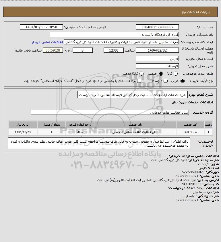 شرح کلی نیاز: خرید خدمات ایاب و ذهاب سایت رادار کو کور لارستان مطابق شرایط پیوست