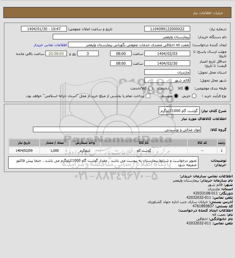 شرح کلی نیاز: گوشت گاو 1000کیلوگرم