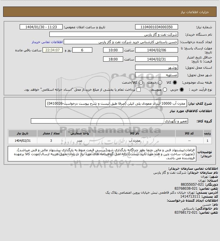 شرح کلی نیاز: مخزن آب 10000 لیتری عمودی پلی اتیلن (صرفا طبق لیست و شرح پیوست درخواست-0410026)