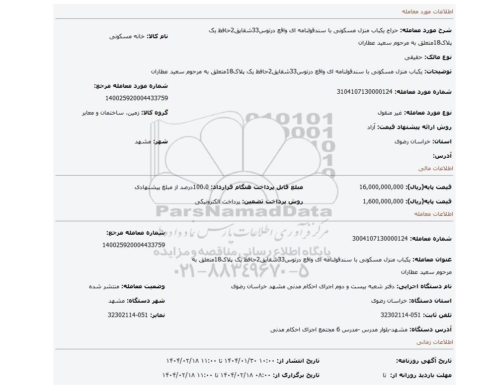 | شماره معامله: 3004107130000124 | شماره معامله مرجع: 140025920004433759 | |