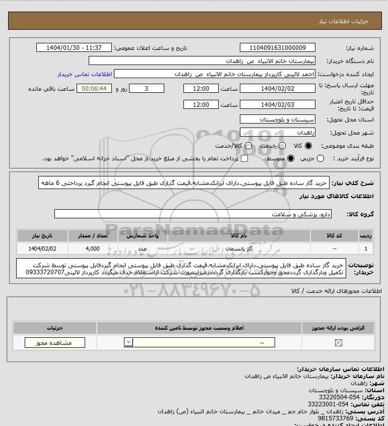 | 1 | -- | گاز پانسمان | عدد | 4,000 | 1404/02/02 |