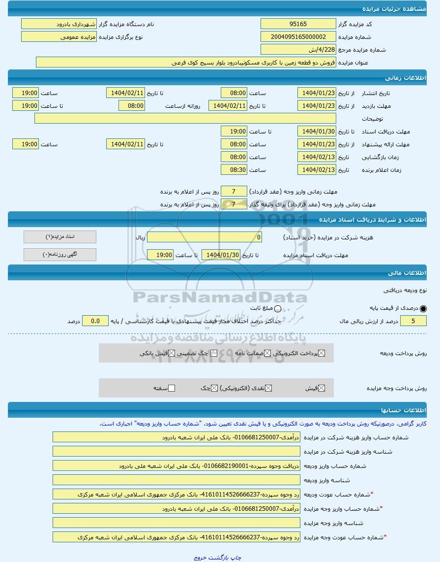 | شماره حساب واریز وجه مزایده | درآمدی-0106681250007- بانک ملی ایران شعبه بادرود |