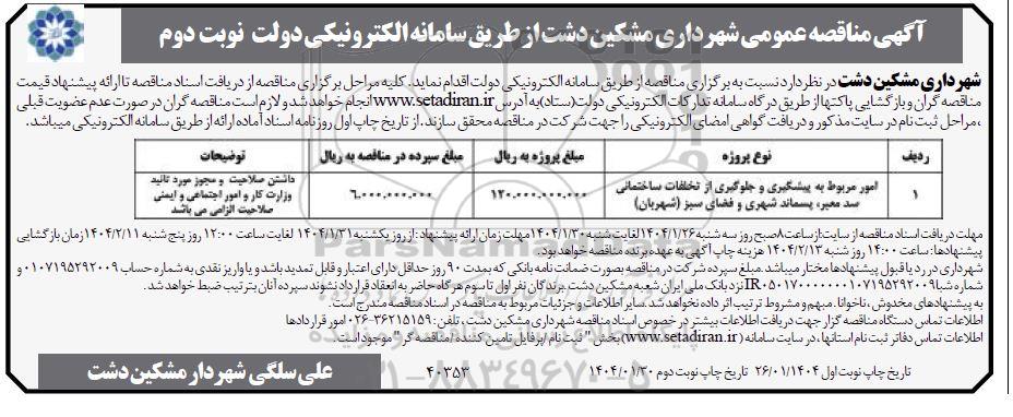 شهرداری مشکین دشت در نظر دارد نسبت به برگزاری مناقصه از طریق سامانه الکترونیکی دولت اقدام نماید. کلیه مراحل برگزاری مناقصه از دریافت اسناد مناقصه تا ارائه پیشنهاد قیمت مناقصه گران و بازگشایی پاکتها از طریق درگاه سامانه تدارکات الکترونیکی دولت (ستاد) به آدرس ستاد ایران انجام خواهد شد و لازم است مناقصه گران در صورت عدم عضویت قبلی مراحل ثبت نام در سایت مذکور و دریافت گواهی امضای الکترونیکی را جهت شرکت در مناقصه محقق سازند. از تاریخ چاپ اول روزنامه اسناد آماده ارائه از طریق سامانه الکترونیکی میباشد.
