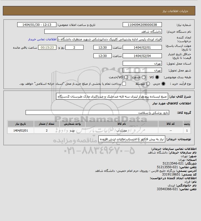 شرح کلی نیاز: منبع ایستاده پنج هزار لیتری سه لایه ضدجلبک و ضدباکتری مارک طبرستان 2دستگاه
