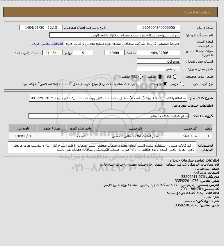 شرح کلی نیاز: سامانه رفاهیات منطقه ویژه (1 نسخه) - طبق مشخصات فایل پیوست - تماس: خانم جریده 09172912815