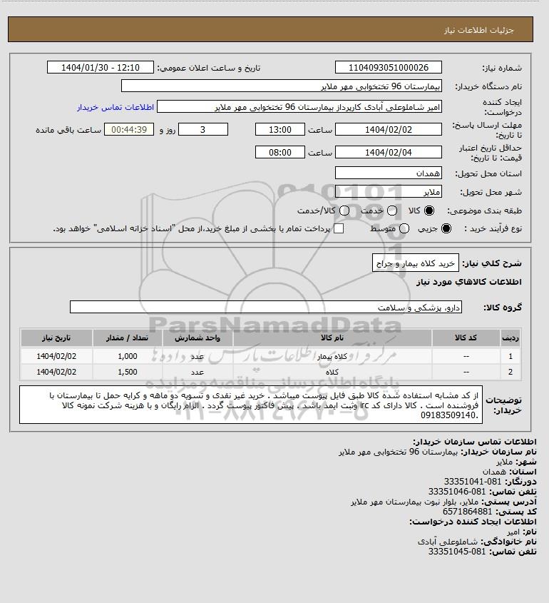 | 1 | -- | کلاه بیمار | عدد | 1,000 | 1404/02/02 |