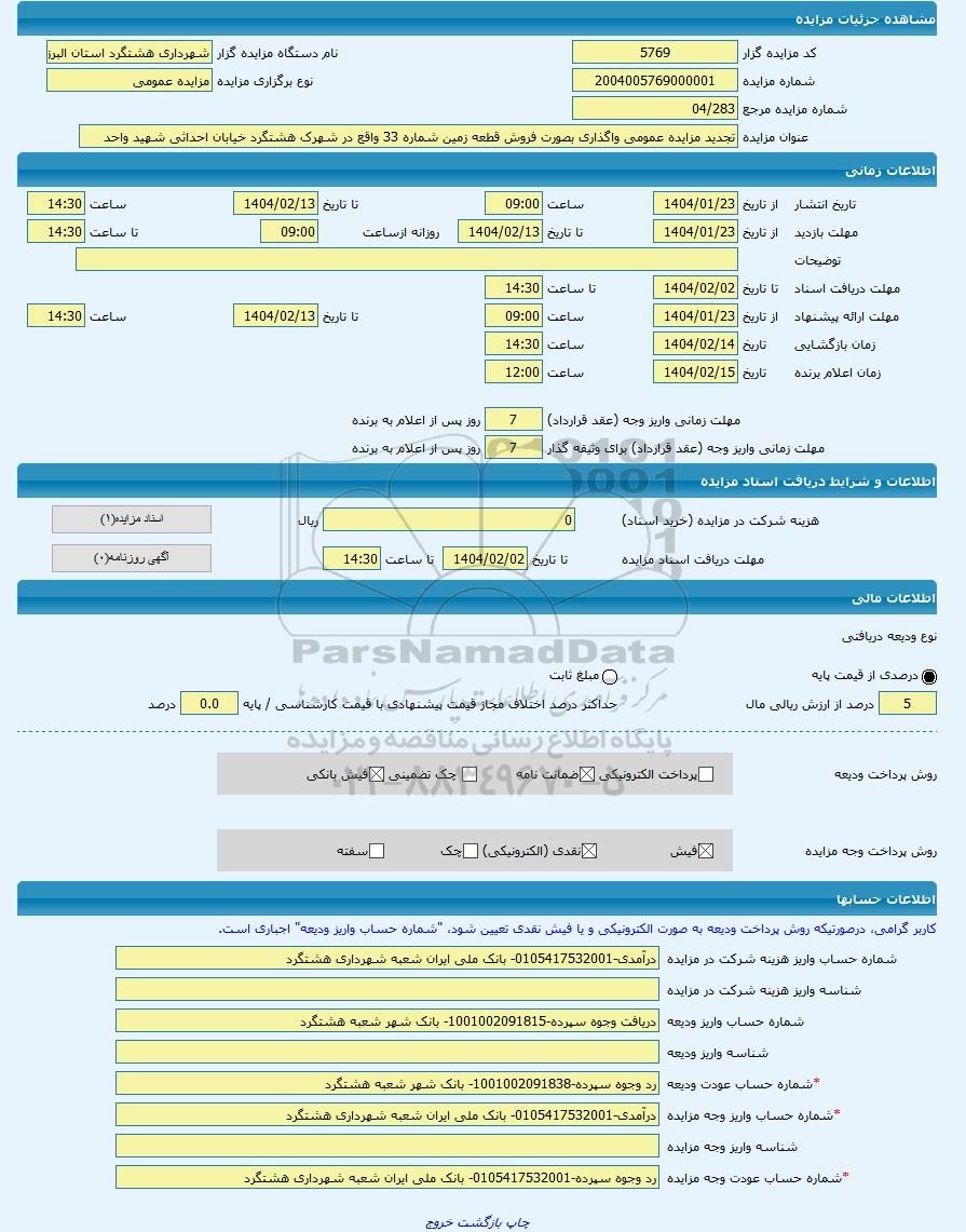 | شماره حساب واریز وجه مزایده | درآمدی-0105417532001- بانک ملی ایران شعبه شهرداری هشتگرد |
