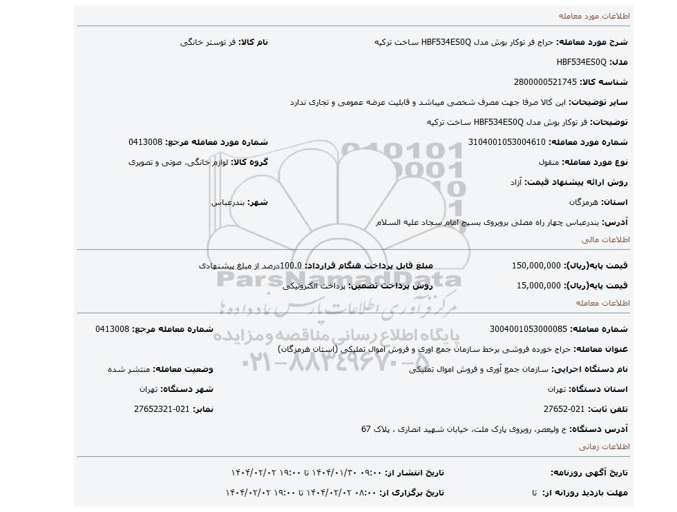 عنوان معامله: حراج خورده فروشی برخط سازمان جمع اوری و فروش اموال تملیکی (استان هرمزگان)