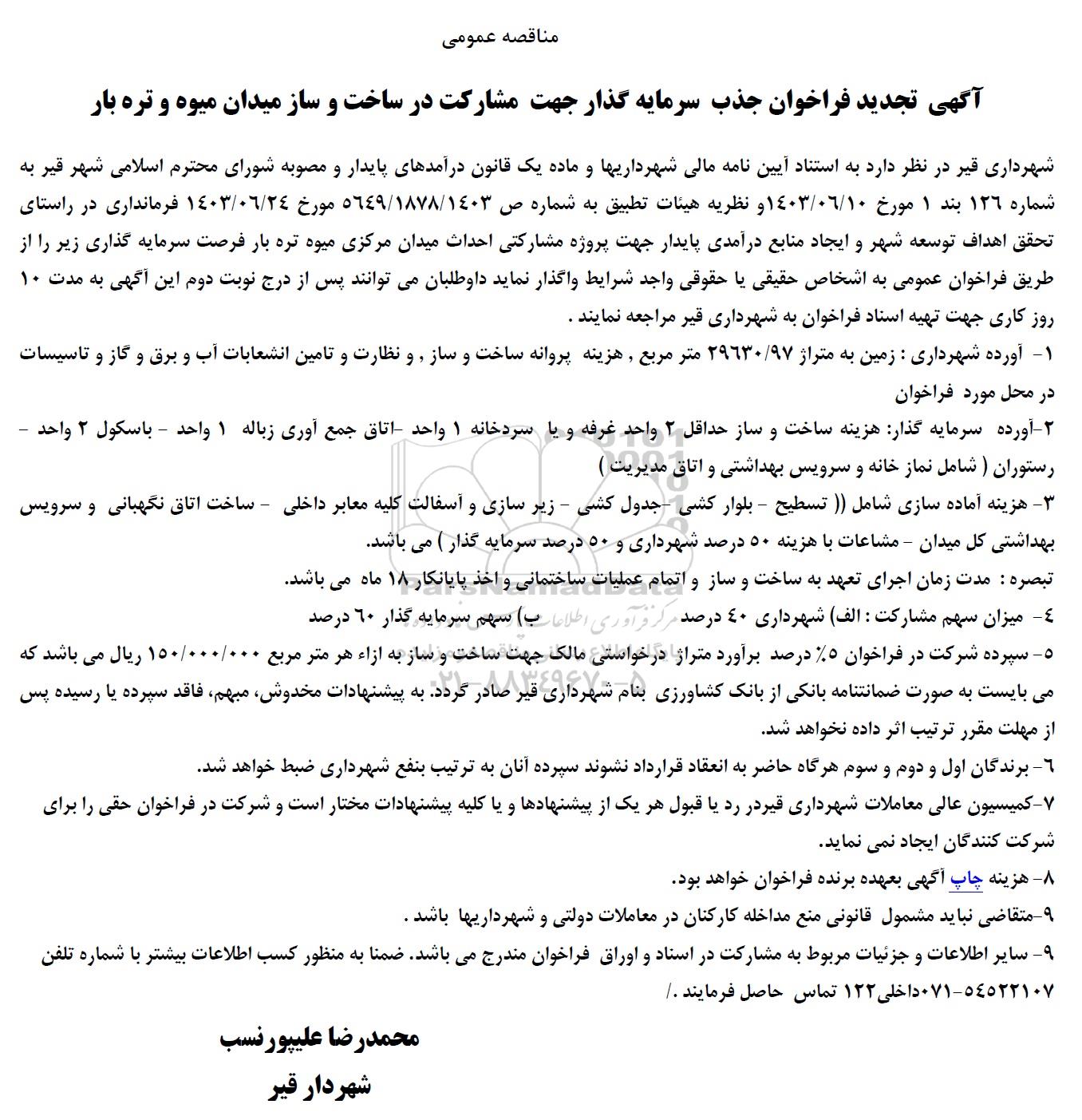 شهرداری قیر در نظر دارد به استناد آیین نامه مالی شهرداریها و ماده یک قانون درآمدهای پایدار و مصوبه شورای محترم اسلامی شهر قیر به شماره 126 بند 1 مورخ 1403.6.10 و نظریه هیئات تطبیق به شماره ص 5649/1878/1403 مورخ 1403.6.24 فرمانداری در راستای تحقق اهداف توسعه شهر و ایجاد منابع درآمدی پایدار جهت پروژه مشارکتی احداث میدان مرکزی میوه تره بار فرصت سرمایه گذاری زیر را از طریق فراخوان عمومی به اشخاص حقیقی یا حقوقی واجد شرایط واگذار نماید .داوطلبان می توانند پس از درج نوبت دوم این آگهی به مدت 10 روز کاری جهت تهیه اسناد فراخوان به شهرداری قیر مراجعه نمایند .
