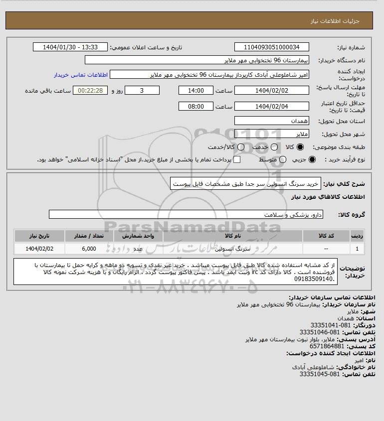 | 1 | -- | سرنگ انسولین | عدد | 6,000 | 1404/02/02 |