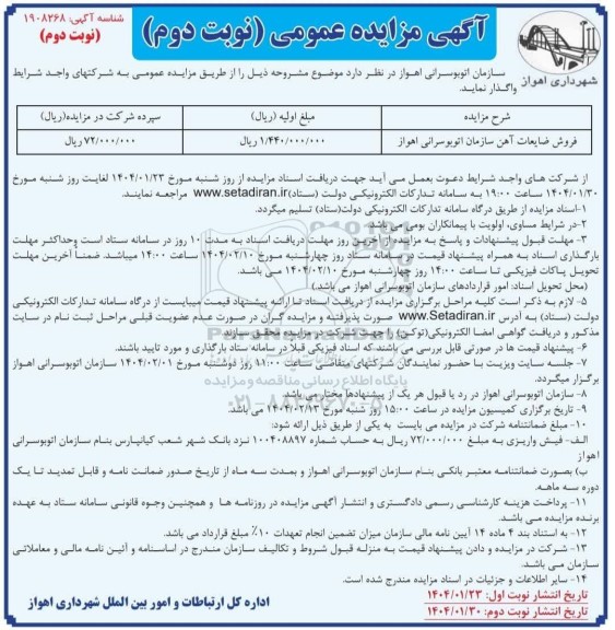 | فروش ضایعات آهن سازمان اتوبوسرانی اهواز | 1.440.000.000 | 72.000.000 |