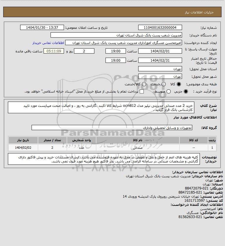 شرح کلی نیاز: خرید 2 عدد صندلی مدیریتی نیلپر مدل ocm812 شرایط کالا اکبند ،گارانتی به روز ، و اصالت صحت میبایست مورد تایید کارشناس بانک قرار گردید ،