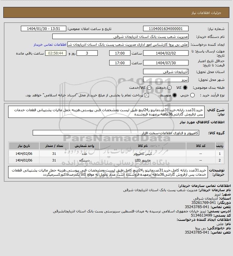 شرح کلی نیاز: خرید31عدد رایانه.خرید31عددمانیتو ر24اینچ طبق لیست ومشخصات فنی پیوستی.هزینه حمل مالیات پشتیبانی قطعات خدمات پس ازفروش گارانتی36ماهه برعهده فروشنده