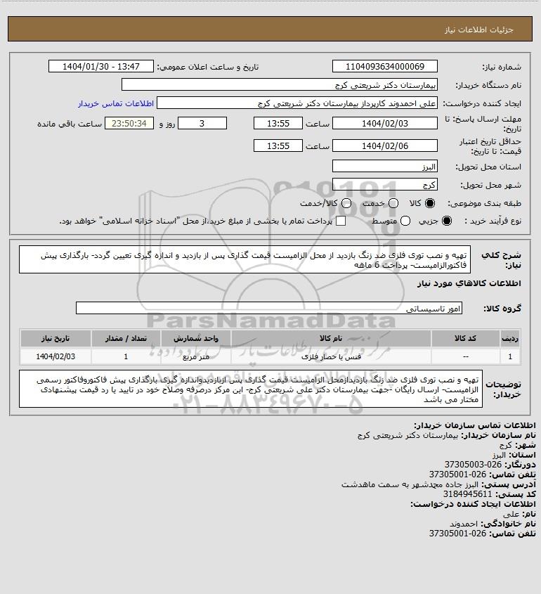 شرح کلی نیاز: تهیه و نصب توری فلزی ضد زنگ بازدید از محل الزامیست قیمت گذاری پس از بازدید و اندازه گیری تعیین گردد- بارگذاری پیش فاکتورالزامیست- پرداخت 6 ماهه