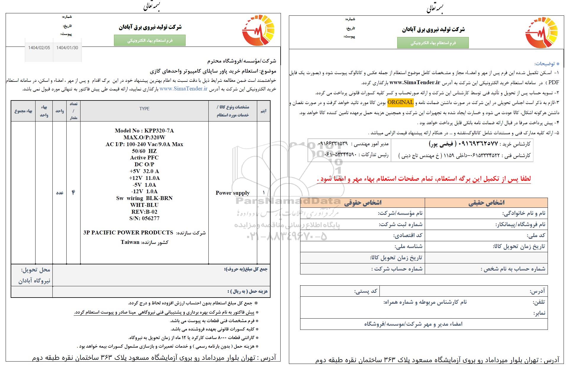 موضوع استعلام : خرید پاور ساپلای کامپیوتر واحدهای گازی