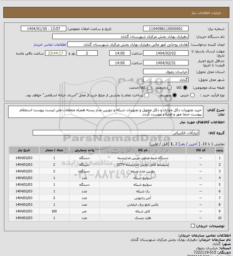 شرح کلی نیاز: خرید تجهیزات دکل مهاری و دکل مونوپل و تجهیزات شبکه و دوربین مدار بسته همراه متعلقات طی لیست پیوست