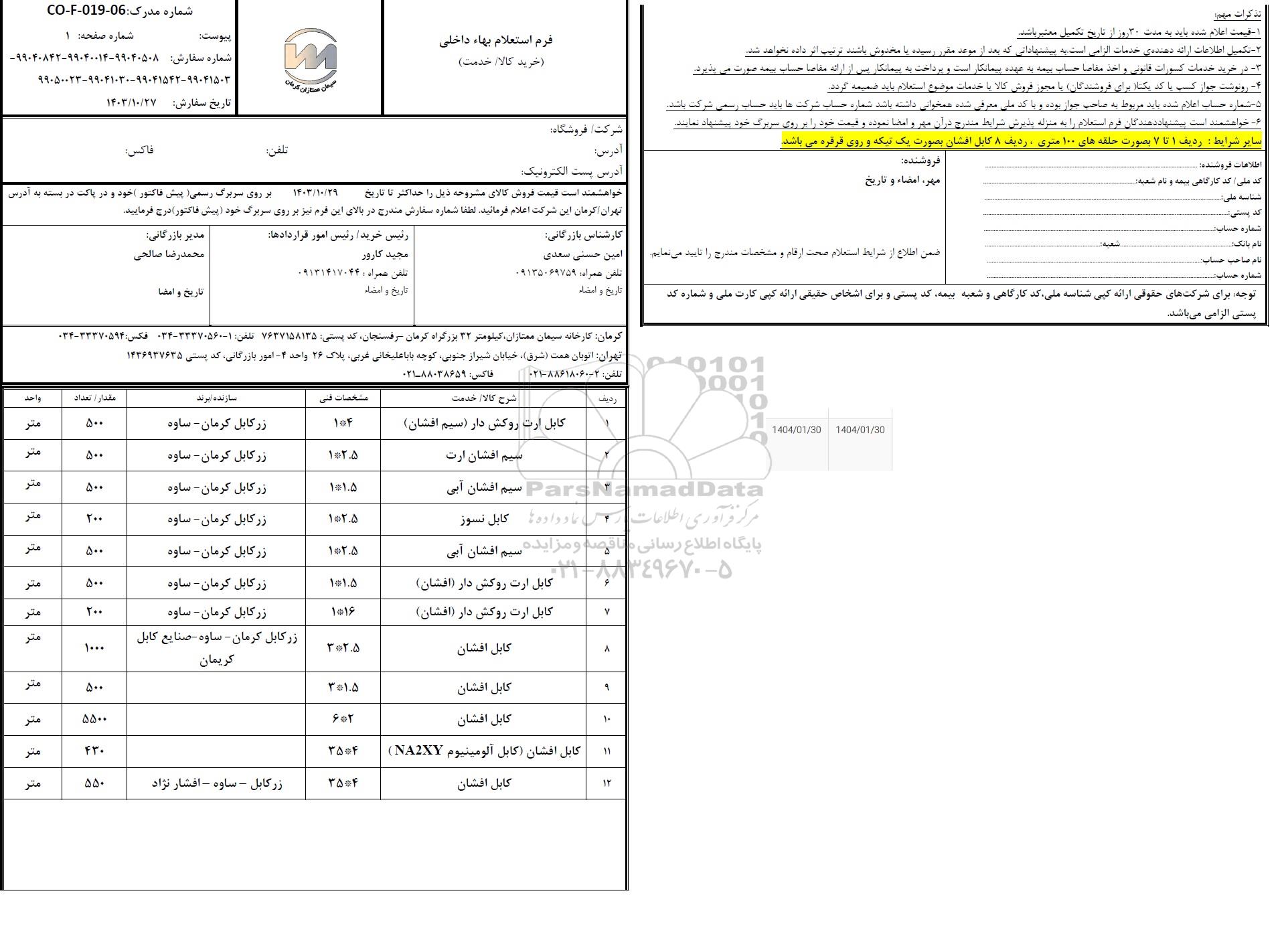 خواهشمند است قیمت فروش کالای مشروحه ذیل را حداکثر تا تاریخ 1403.10.289 بر روی سربرگ رسمی (پیش فاکتور) خود و در پاکت دربسته به آدرس تهران/ کرمان این شرکت اعلام فرمایید. لطفا شماره سفارش مندرج در بالای این فرم نیز بر روی سربرگ خود (پیش فاکتور) درج فرمایید.