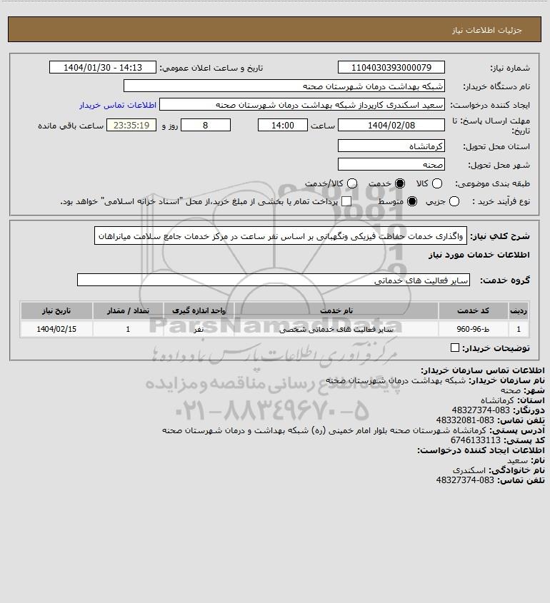 شرح کلی نیاز: واگذاری خدمات حفاظت فیزیکی ونگهبانی بر اساس نفر ساعت در مرکز خدمات جامع سلامت میانراهان