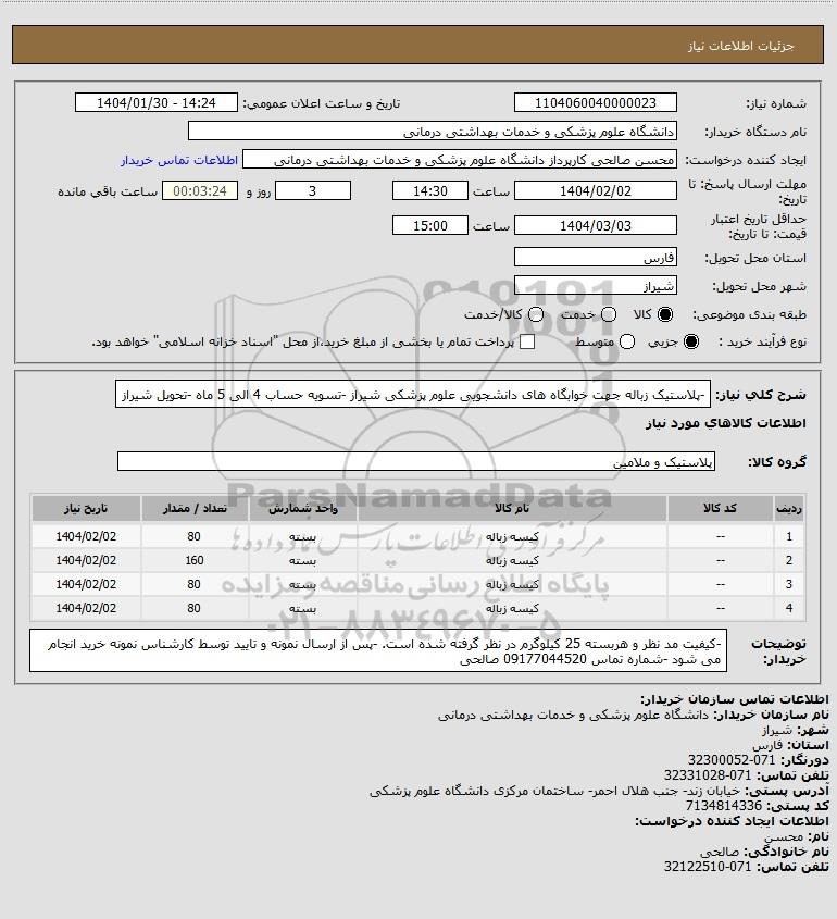 شرح کلی نیاز: -پلاستیک زباله جهت خوابگاه های دانشجویی علوم پزشکی شیراز