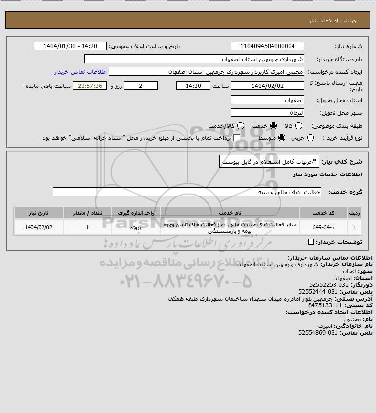 استعلام بها و موضوع استعلام استعلام *جزئیات کامل استعلام در فایل پیوست به اطلاع کلیه شرکتها و افراد متخصص واجد شرایط میرساند، آگهی گذار در نظر دارد از طریق استعلام بها، نسبت به انتخاب و دریافت پیشنهادات اقدام نماید. این استعلام با کد آگهی ثبت شده در سامانه خبرگزاری پارس نماد : 8895584 منتشر شده است. مشخصات استعلام : تاریخ شروع استعلام: 1404/01/30 آخرین مهلت ارسال پیشنهاد قیمت : 1404/02/02 و محل اجرای پروژه : استان اصفهان میباشد. استعلام قیمت مورد درخواست : استعلام *جزئیات کامل استعلام در فایل پیوست با دستهبندیهای تخصصی و گروه های مرتبط : خدمات بیمه ای, استعلام اطلاع رسانی میگردد.