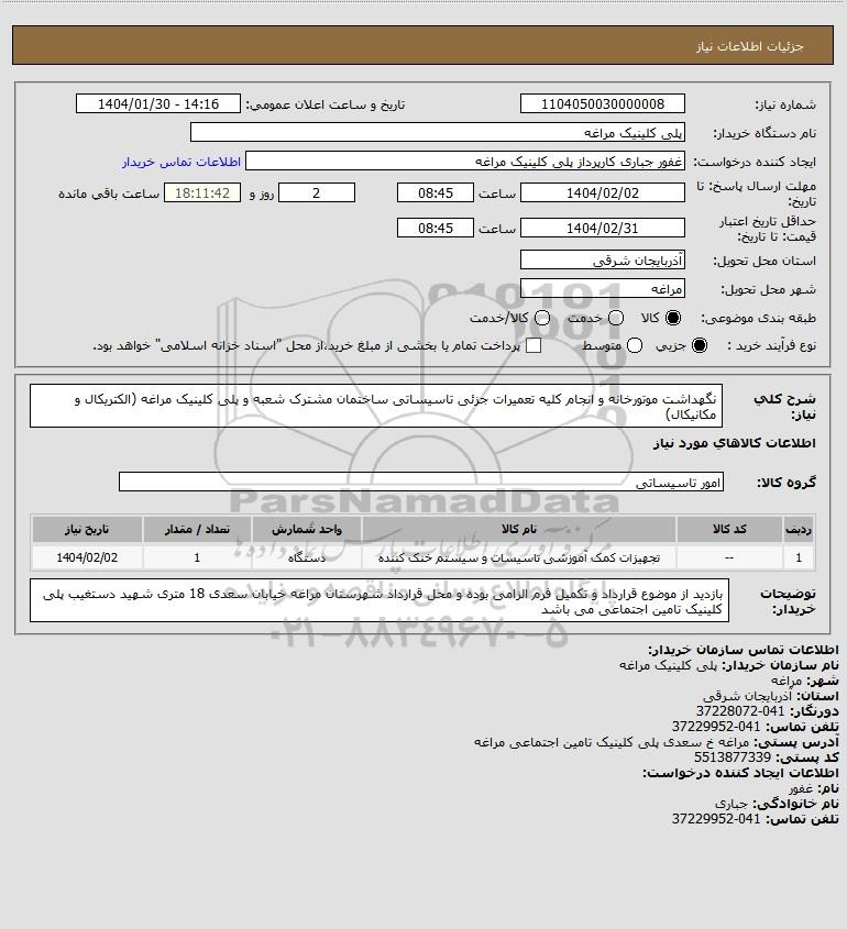 شرح کلی نیاز: نگهداشت موتورخانه و انجام کلیه تعمیرات جزئی تاسیساتی ساختمان مشترک شعبه و پلی کلینیک مراغه (الکتریکال و مکانیکال)