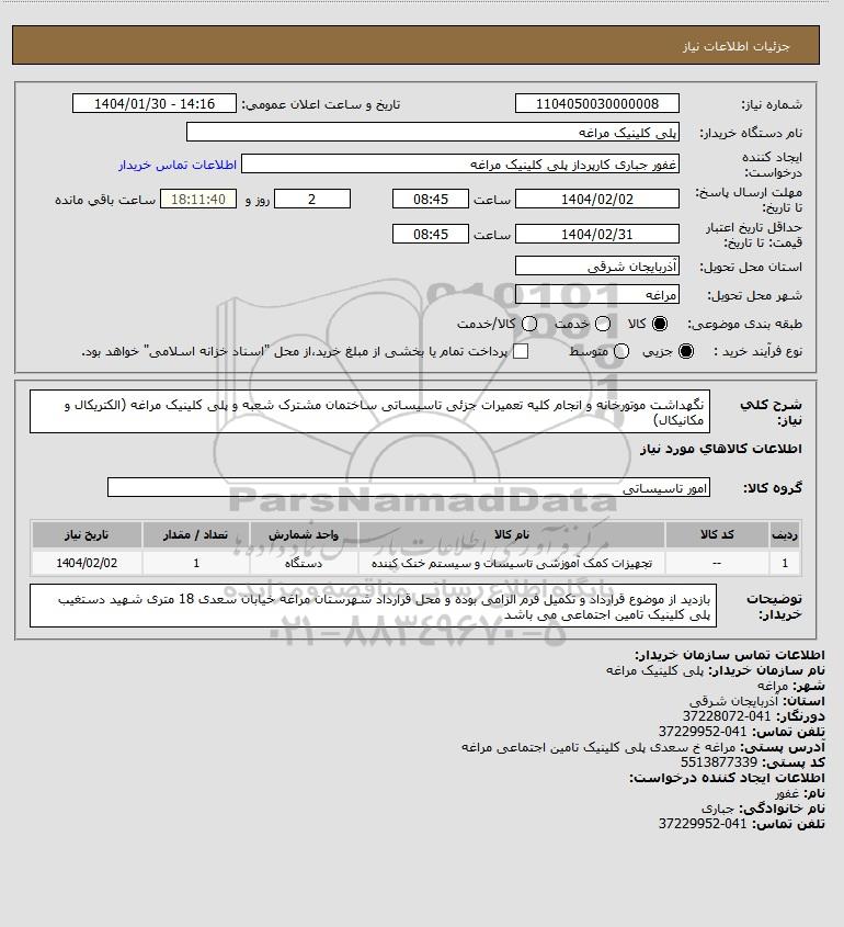 شرح کلی نیاز: نگهداشت موتورخانه و انجام کلیه تعمیرات جزئی تاسیساتی ساختمان مشترک شعبه و پلی کلینیک مراغه (الکتریکال و مکانیکال)