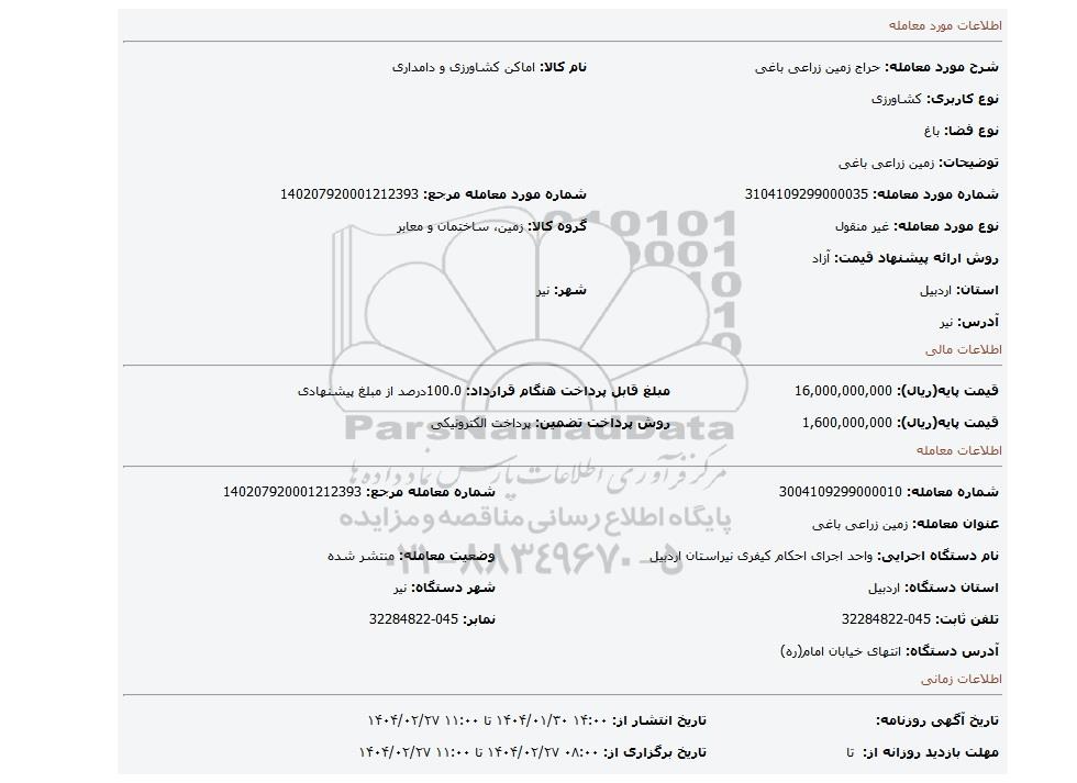 | شرح مورد معامله: حراج زمین زراعی باغی | نام کالا: اماکن کشاورزی و دامداری | |