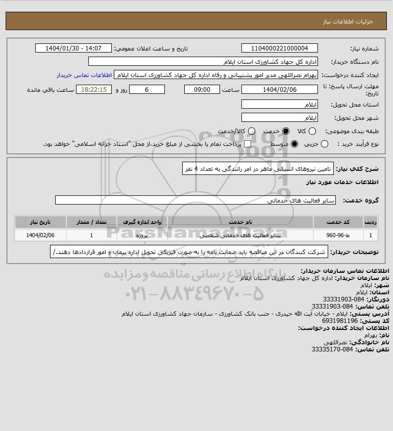 شرح کلی نیاز: تامین نیروهای انسانی ماهر در امر رانندگی به تعداد 4 نفر