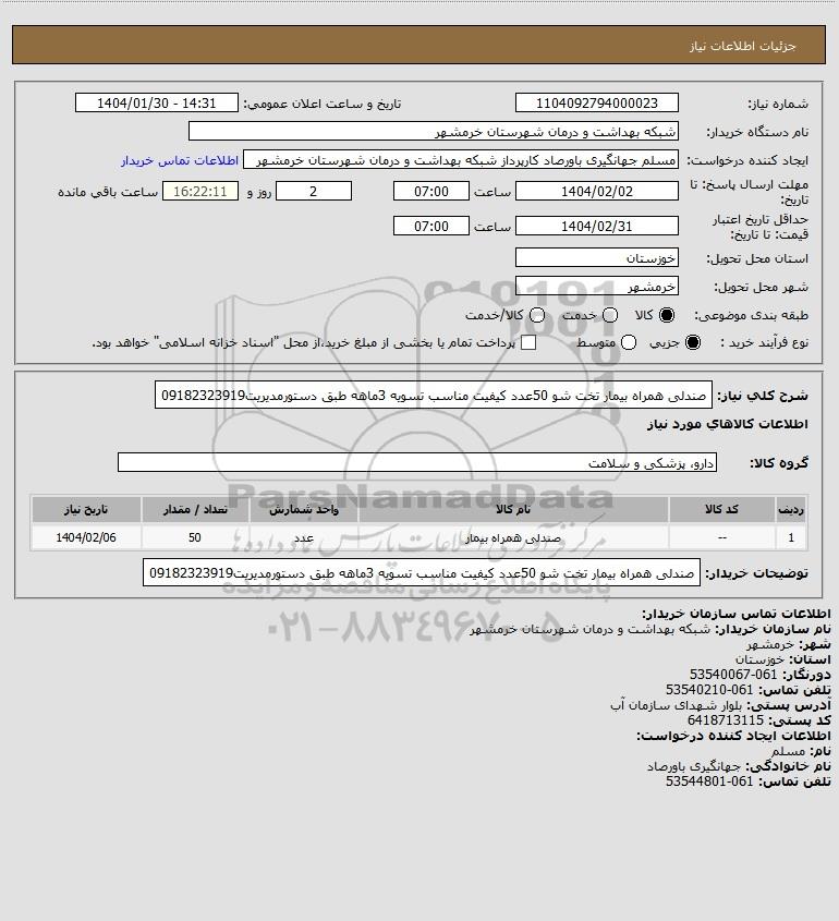 | 1 | -- | صندلی همراه بیمار | عدد | 50 | 1404/02/06 |