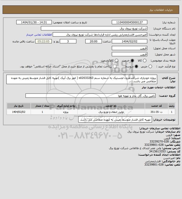 شرح کلی نیاز: پروژه خودیاری شرکت مزون لجستیک به شماره سنم s02033263 ( امور برق آبیک )تهییه کابل فشار متوسط زمینی به عهده متقاضی می باشد.