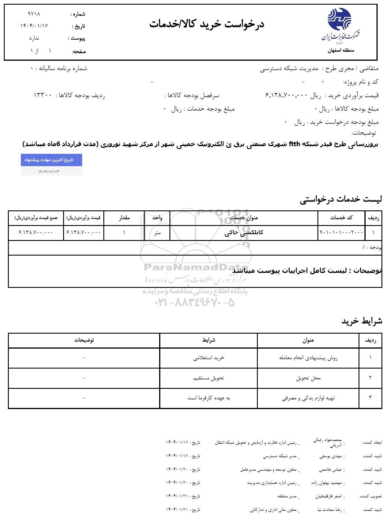 بروزرسانی طرح فیدر شبکه FTTH شهرک صنعتی برقی الکترونیک خمینی شهر از مرکز شهید نوروزی مدت قرارداد 6 ماه میباشد