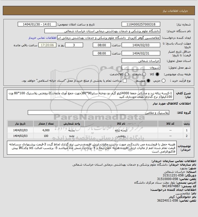 شرح کلی نیاز: 1-کیسه زباله زرد و مشکی جمعا 4000کیلو گرم دو دوخته سایز90*80(جهت جمع آوری مایعات)2-روتختی پلاستیک 100*80 وزن 100کیلو(از نرخ گذاری نقدی خودداری کنید