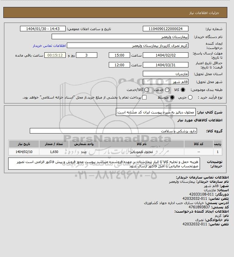 استعلام محلول دیالیز به شرح پیوست ایران کد مشابه است, استعلام محلول دیالیز به شرح پیوست ایران کد مشابه است
