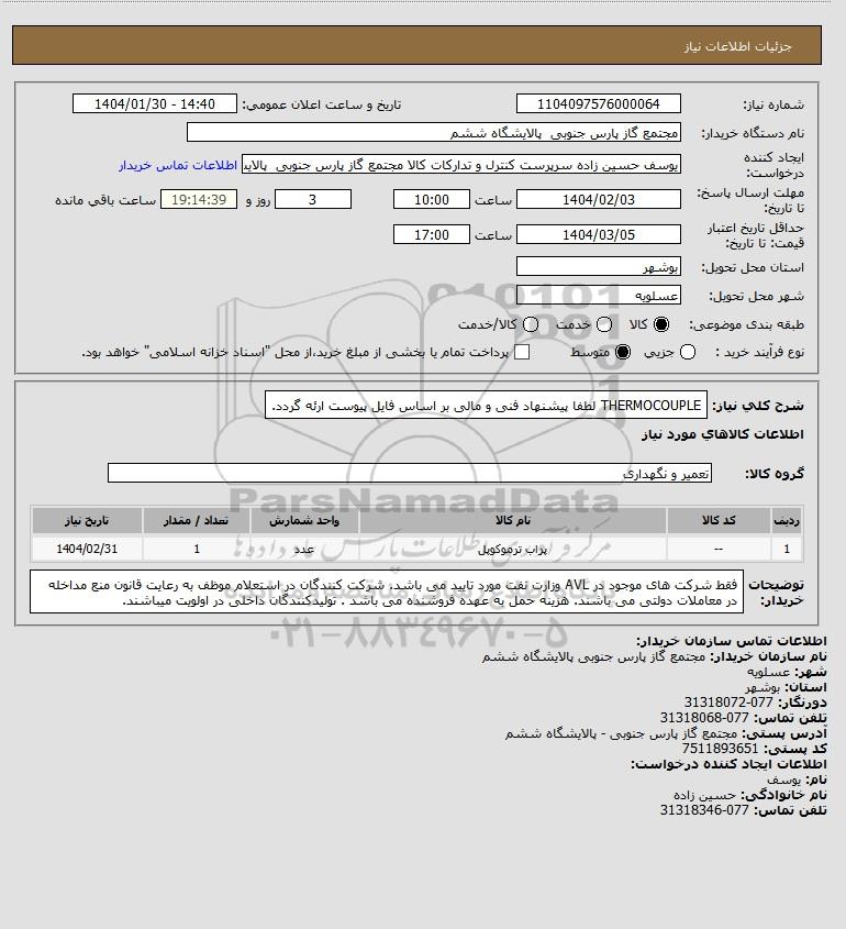 شرح کلی نیاز: THERMOCOUPLE لطفا پیشنهاد فنی و مالی بر اساس فایل پیوست ارئه گردد.